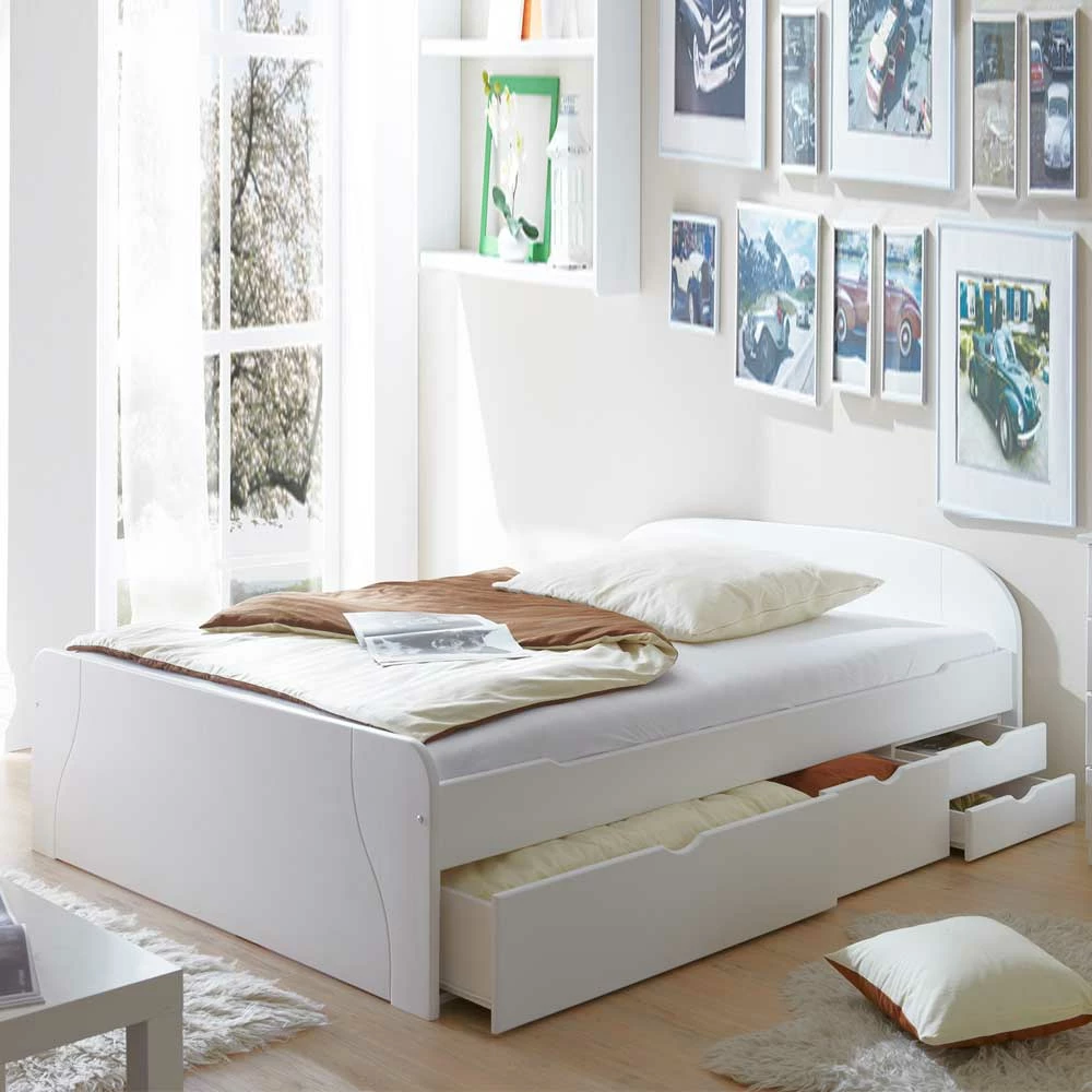- Vier Schubkästen auf Metallschienen in drei Größen unterhalb der Liegefläche