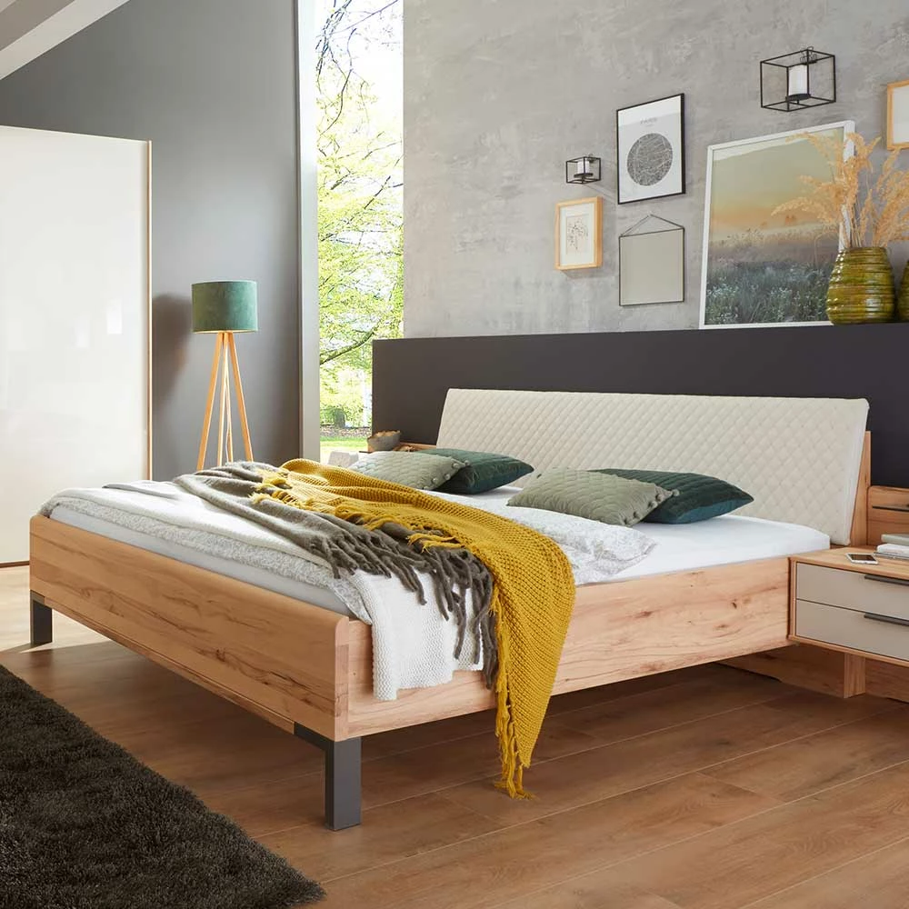 - Holzwerkstoff Oberflächen (Kopfteil, Bettseiten und Wange) in Holzoptik Astkernbuche foliert, Massivholz (Fußteil) lackiert