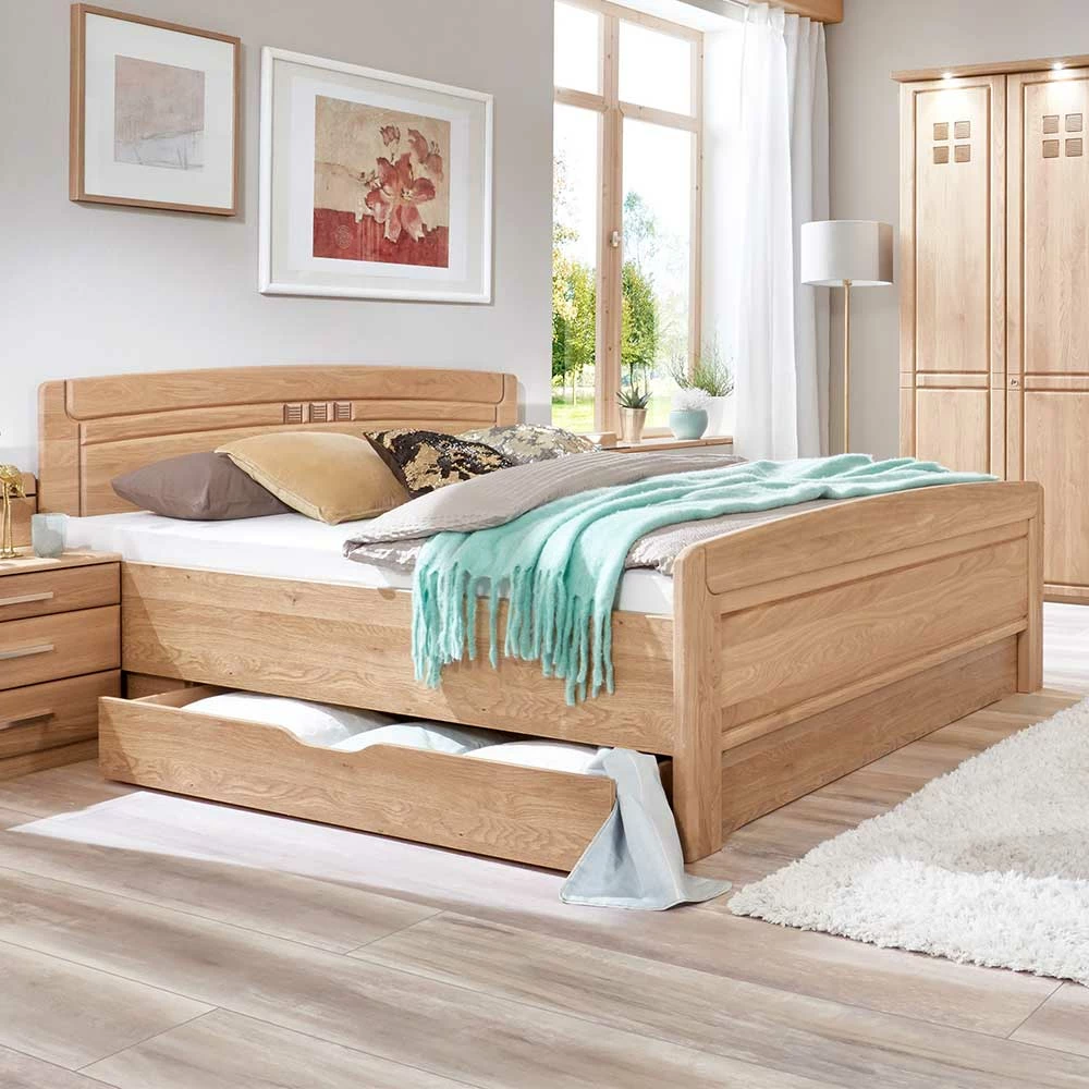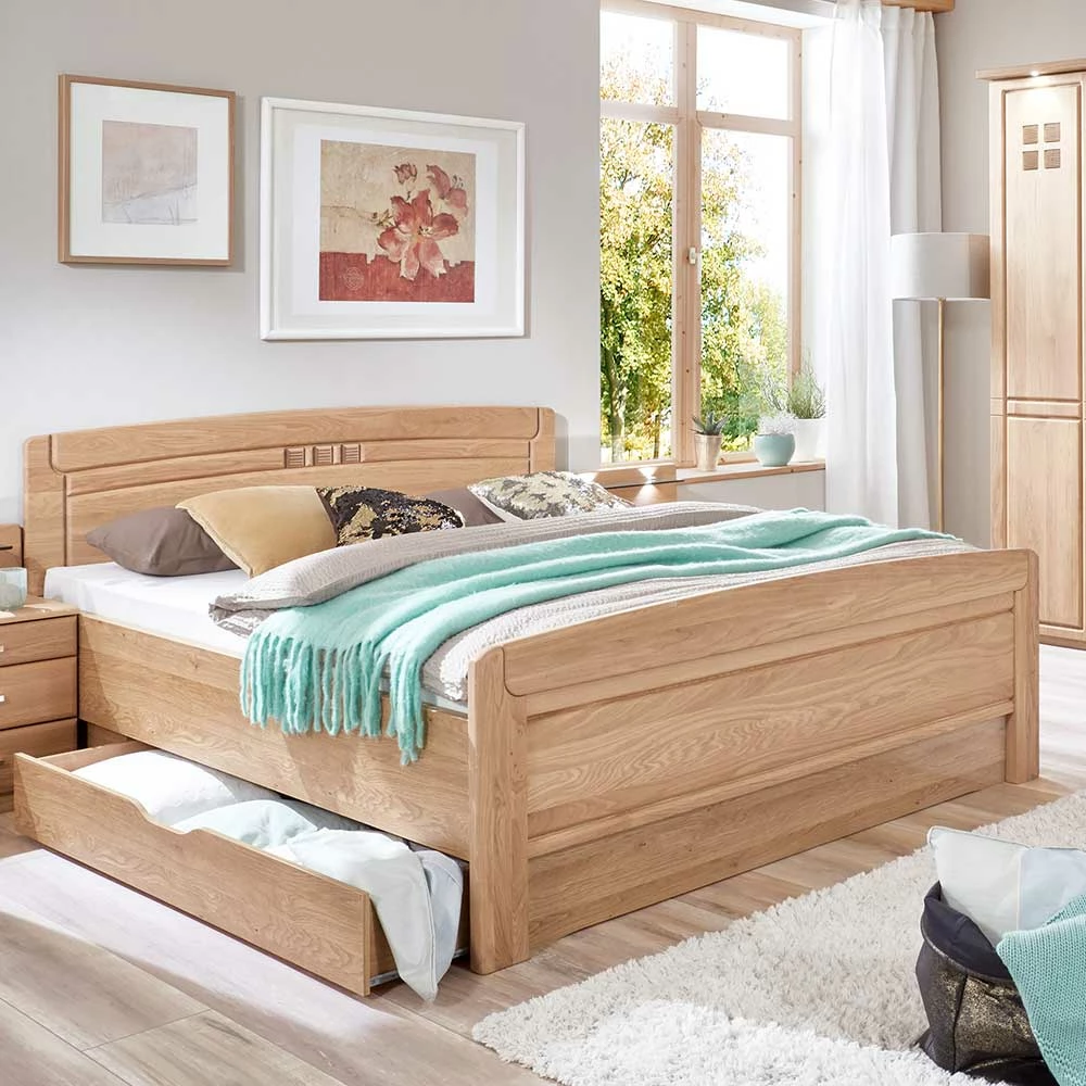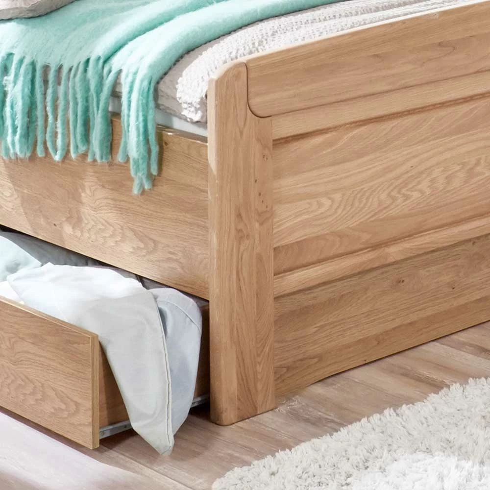 - Holzwerkstoff Oberflächen (unteres Kopfteil und Bettseiten) in Holzoptik Eiche foliert, Massivholz (Fußteil und oberes Kopfteil) lackiert