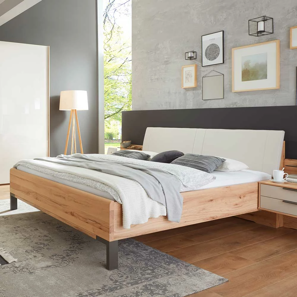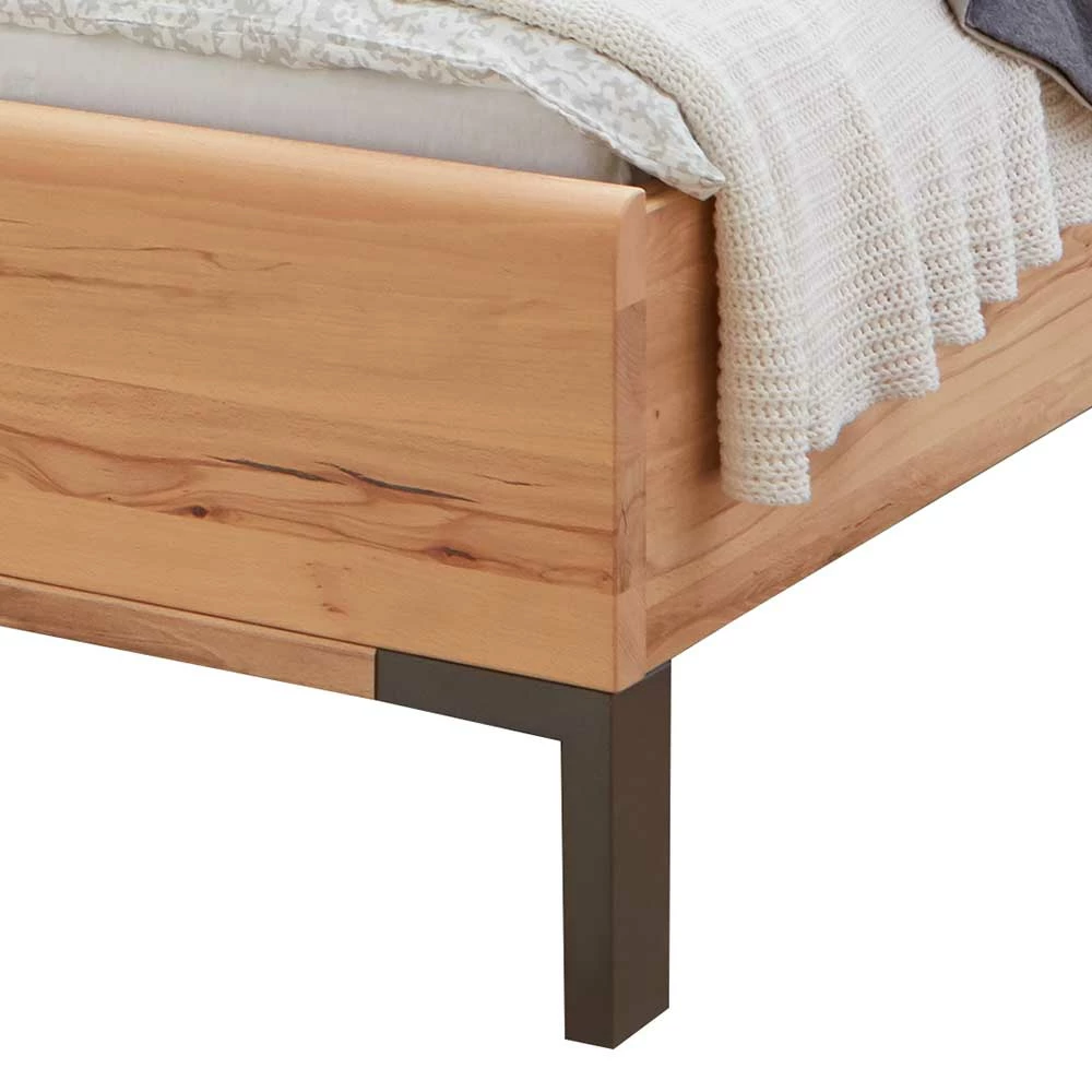 - Holzwerkstoff Oberflächen (Kopfteil, Bettseiten und Wange) in Holzoptik Astkernbuche foliert, Massivholz (Fußteil) lackiert